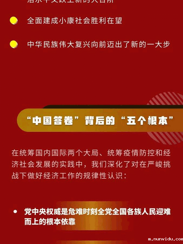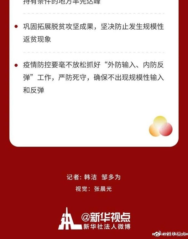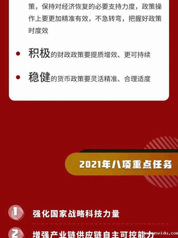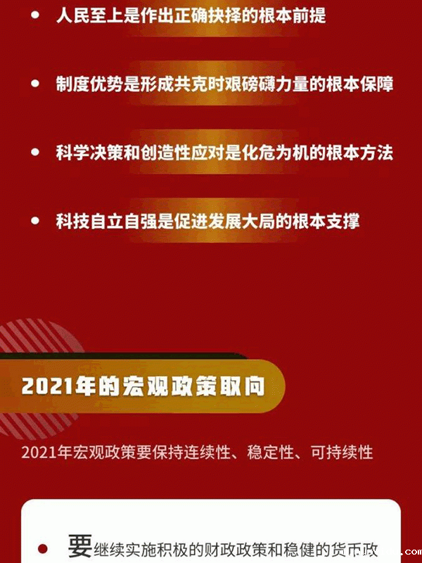 会议强调,明年是我国现代化建设进程中具有特殊重要性的一年。做好明年经济工作,要以习近平新时代中国特色社会主义思想为指导,全面贯彻党的十九大和十九届二中、三中、四中、五中全会精神,坚持稳中求进工作总基调,立足新发展阶段,贯彻新发展理念,构建新发展格局,以推动高质量发展为主题,以深化供给侧结构性改革为主线,以改革创新为根本动力,以满足人民日益增长的美好生活需要为根本目的,坚持系统观念,巩固拓展疫情防控和经济社会发展成果,更好统筹发展和安全,扎实做好“六稳”工作、全面落实“六保”任务,科学精准实施宏观政策,努力保持经济运行在合理区间,坚持扩大内需战略,强化科技战略支撑,扩大高水平对外开放,确保“十四五”开好局,以优异成绩庆祝建党100周年。