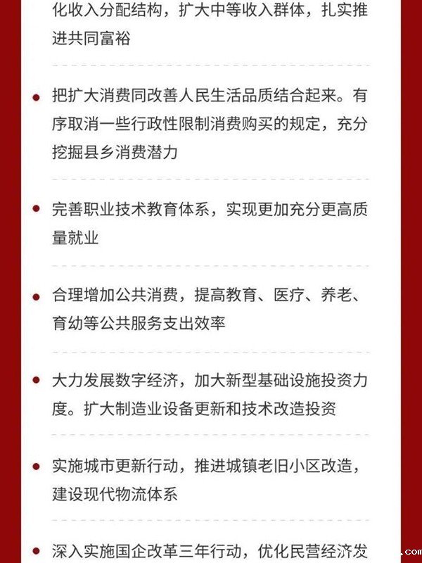 三是坚持扩大内需这个战略基点。形成强大国内市场是构建新发展格局的重要支撑,必须在合理引导消费、储蓄、投资等方面进行有效制度安排。扩大消费最根本的是促进就业,完善社保,优化收入分配结构,扩大中等收入群体,扎实推进共同富裕。要把扩大消费同改善人民生活品质结合起来。有序取消一些行政性限制消费购买的规定,充分挖掘县乡消费潜力。要完善职业技术教育体系,实现更加充分更高质量就业。要合理增加公共消费,提高教育、医疗、养老、育幼等公共服务支出效率。要增强投资增长后劲,继续发挥关键作用。要发挥中央预算内投资在外溢性强、社会效益高领域的引导和撬动作用。激发全社会投资活力。要大力发展数字经济,加大新型基础设施投资力度。要扩大制造业设备更新和技术改造投资。要实施城市更新行动,推进城镇老旧小区改造,建设现代物流体系。要加强统一规划和宏观指导,统筹好产业布局,避免新兴产业重复建设。