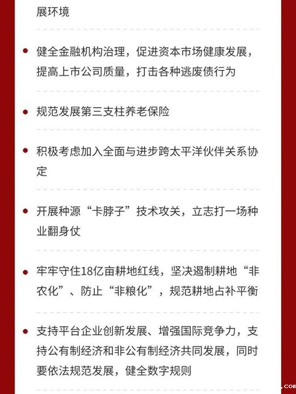 四是全面推进改革开放。构建新发展格局,必须构建高水平社会主义市场经济体制,实行高水平对外开放,推动改革和开放相互促进。要完善宏观经济治理,加强国际宏观政策协调。要深入实施国企改革三年行动,优化民营经济发展环境,健全现代企业制度,完善公司治理,激发各类市场主体活力。要放宽市场准入,促进公平竞争,保护知识产权,建设统一大市场,营造市场化、法治化、国际化营商环境。要健全金融机构治理,促进资本市场健康发展,提高上市公司质量,打击各种逃废债行为。要规范发展第三支柱养老保险。要积极考虑加入全面与进步跨太平洋伙伴关系协定。要大力提升国内监管能力和水平,完善安全审查机制,重视运用国际通行规则维护国家安全。