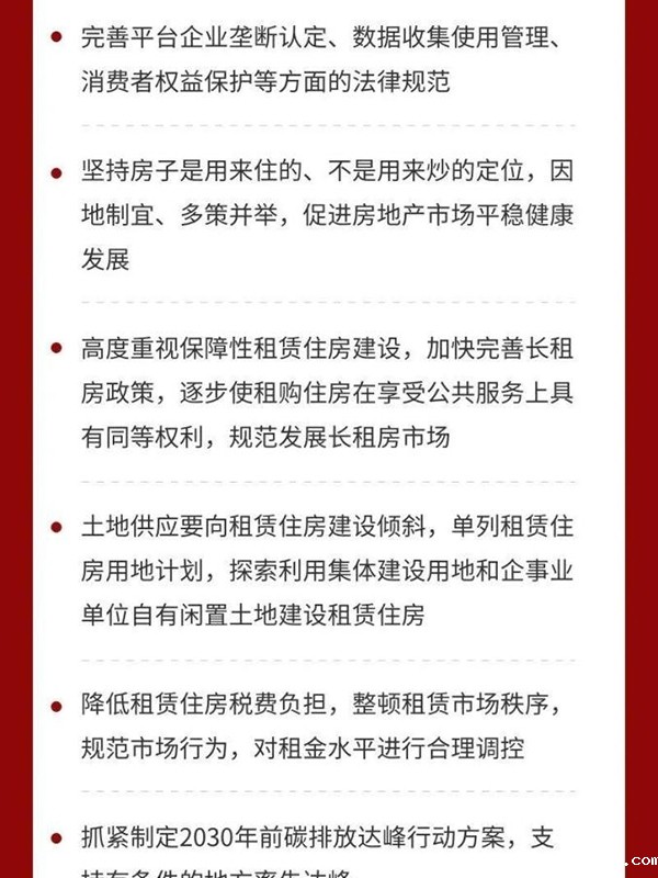 七是解决好大城市住房突出问题。住房问题关系民生福祉。要坚持房子是用来住的、不是用来炒的定位,因地制宜、多策并举,促进房地产市场平稳健康发展。要高度重视保障性租赁住房建设,加快完善长租房政策,逐步使租购住房在享受公共服务上具有同等权利,规范发展长租房市场。土地供应要向租赁住房建设倾斜,单列租赁住房用地计划,探索利用集体建设用地和企事业单位自有闲置土地建设租赁住房,国有和民营企业都要发挥功能作用。要降低租赁住房税费负担,整顿租赁市场秩序,规范市场行为,对租金水平进行合理调控。